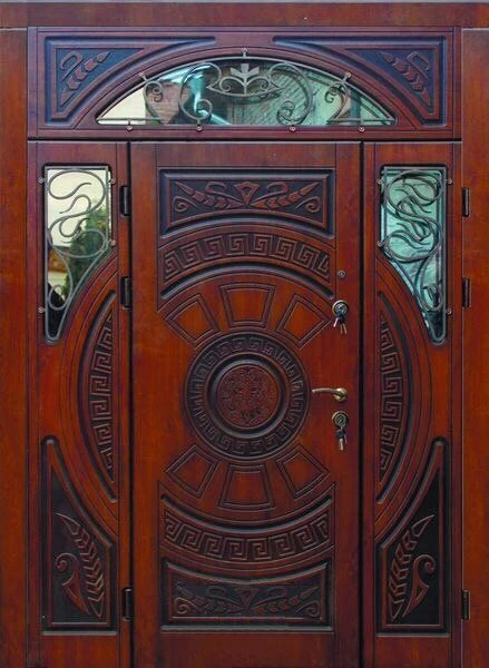 Парадные двери относятся к изделиям премиум-класса. Изготавливаются такие модели из металла толщиной не менее 2,0 мм, конструкция усиливается ребрами жесткости. Основной фактор, делающий парадные двери таковыми – их внешняя отделка. Для декора этих дверей, как правило, используют массив дуба, ясеня или сосны, натуральный шпон, корабельную фанеру, МДФ-панель, покрытую атмосфероустойчивой пленкой Винорит (VINORIT). Декоративные вставки из антивандального стекла, с применением элементов ковки, рисунок, который будет сочетаться с рисунком решеток на окнах, придаст коттеджу неповторимый внешний вид. Можно декорировать дверь витражным узором – и ваш дом заиграет яркими красками. По конструкции парадные двери могут быть как одностворчатыми, так и двустворчатым. При достаточной высоте проема, можно изготовить входную группу с декоративной вставкой сверху – прямоугольную или в виде арки. Терморазрыв в конструкции парадной двери сохранит тепло в доме, и предотвратит промерзание и кондедсирование двери в холодное время года, при этом не требуется обустройство в доме холодного тамбура.
